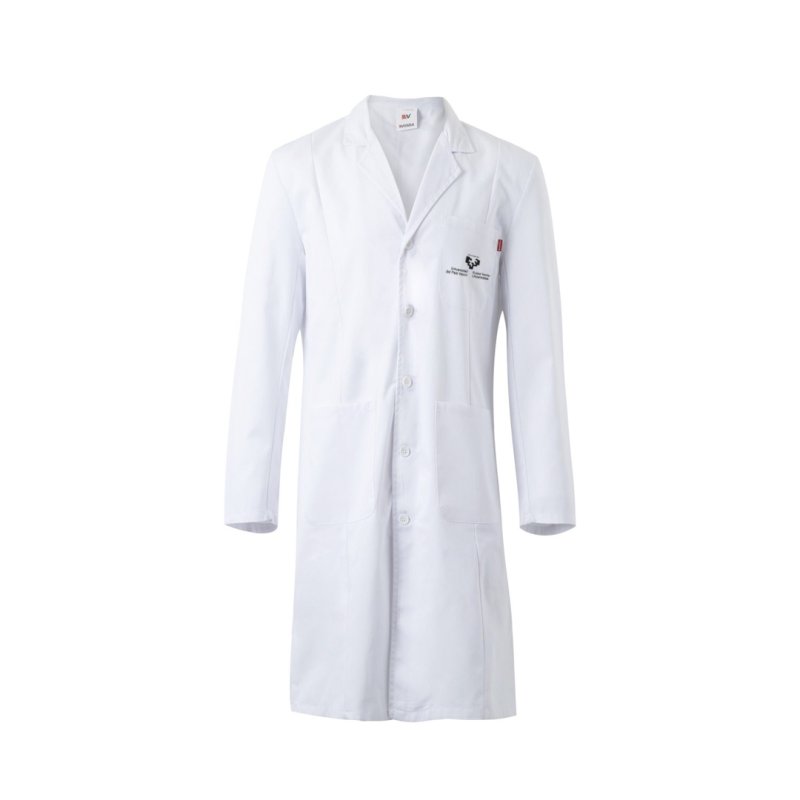 Bata semientallada hombre. Cierre central con botones. Manga tipo sastre de dos piezas. Cinturón en la espalda. Abertura trasera. Semientallada. Costadillos frontales y traseros. Costura de seguridad en la espalda. Tres bolsillos: 3 bolsillos de parche