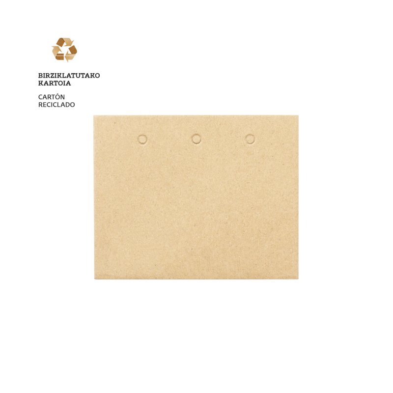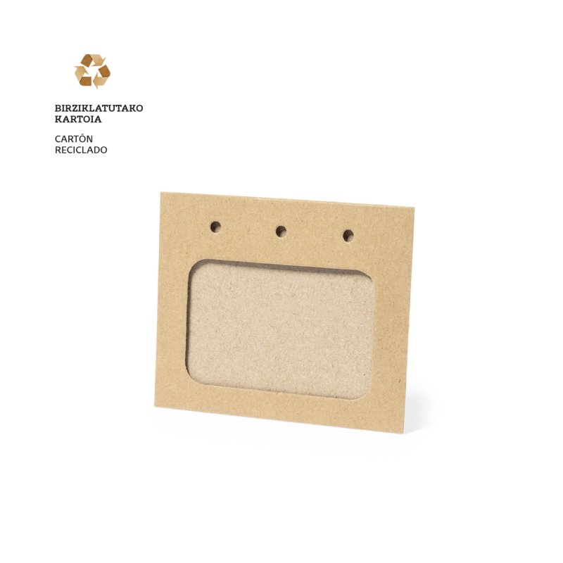 Identificador fabricado en resistente cartón reciclado. Con triple troquelado y ventana de 8,5x5,3 cm.