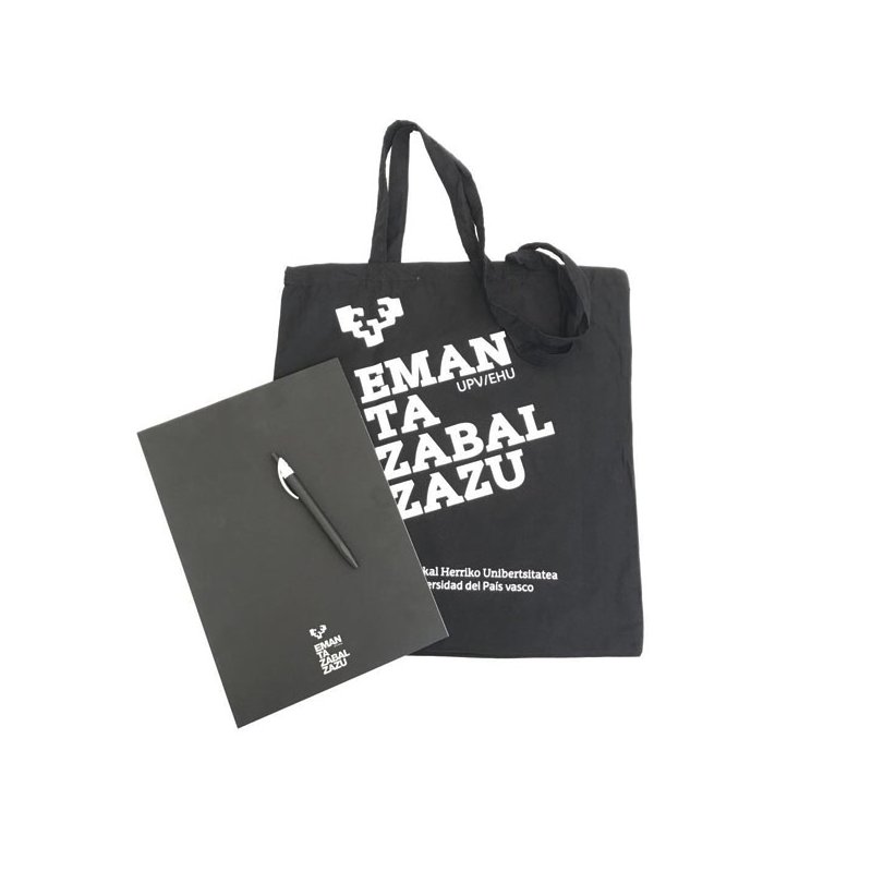 Propuesta para congresos nº1 Incluye; cuaderno vertical hoja blanca, boligrafo reciclado negro/blanco y bolsa de algodón negra. Marcado con el anagrama de UPV/EHU Personalizacion bajo presupuesto