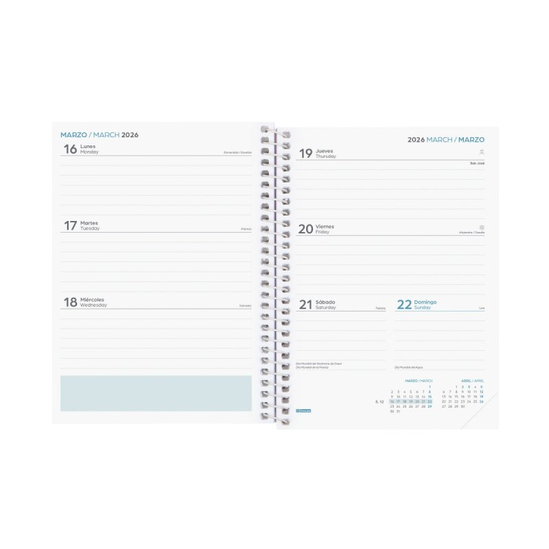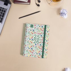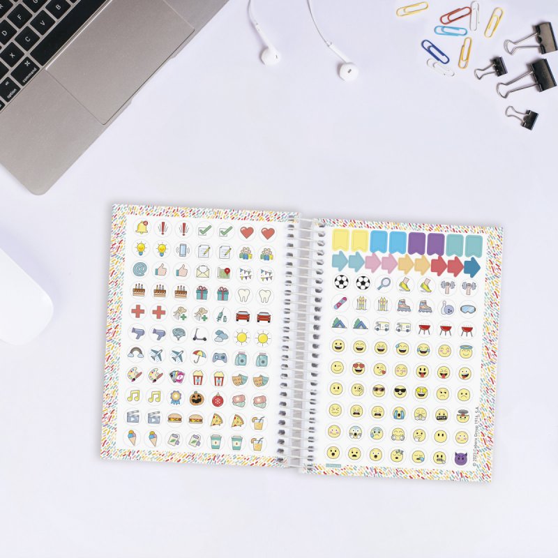Agenda orientada a la organización del curso lectivo. Espiral simple metálica, goma elástica y tapas de polipropileno con diseños de portada variados y en tendencia. Con pegatinas temáticas para personalizar el interior. Las esquinas son microperforadas para localizar rápidamente el día/semana en curso. Agenda con información