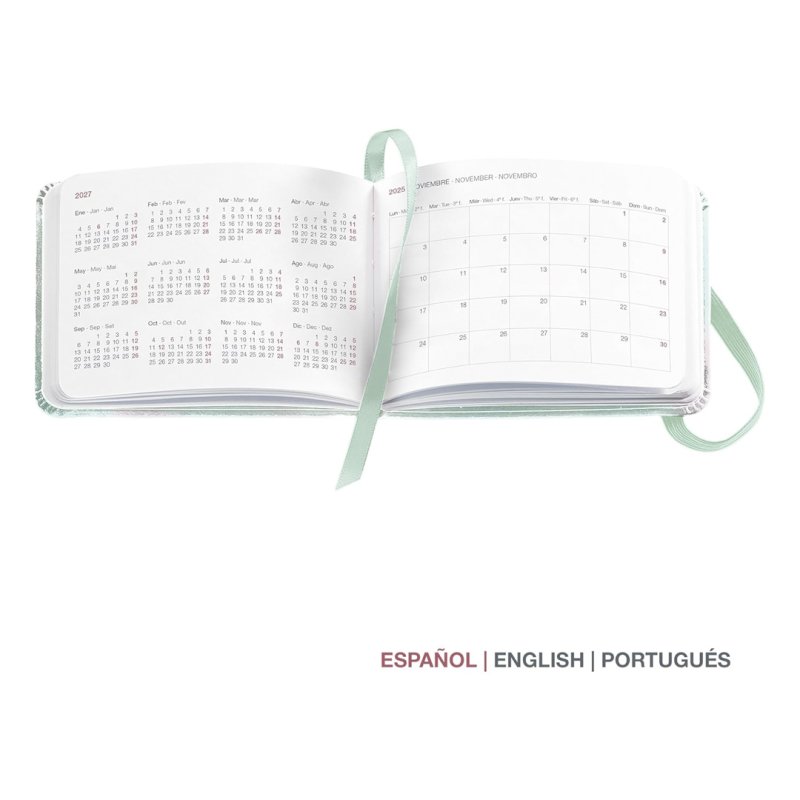 Incluye bolsillo interior, goma elástica, calendarios, planning mensual y espacio para notas.