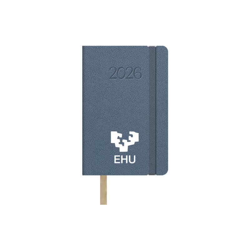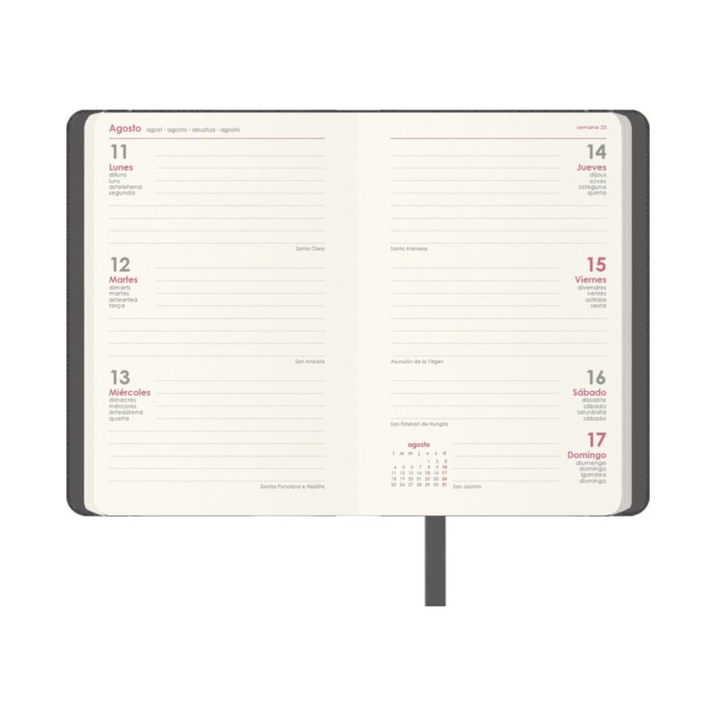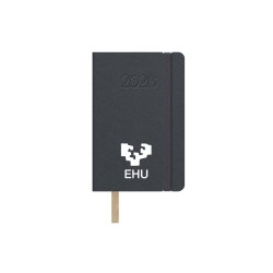 Agenda anual. Cubierta flexible realizada en polipiel con cartulina Negra contracolado de primera calidad y puntas redondeadas. Estampación del año en color Negro en la portada. Encuadernación cosida con lomo redondo y cierre de goma elástica plana y cinta de registro color Negro. Interior semana vista tamaño bolsillo, impresa a un color en papel offset ahuesado de 70 grs., con 144 páginas. Datos