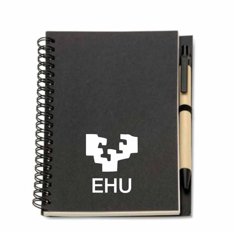 Libreta con cubierta negra o marrón natural con 70 páginas de papel reciclado y un bolígrafo reciclado biodegradable de tinta azul.