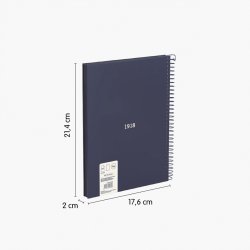 Cuaderno Miquelrius, tamaño A4 (210 x 297 mm). Cubiertas: Polipropileno opaco de 0,8 mm, ligero y resistente. Espiral: Metálica continua que permite la apertura en plano del cuaderno, además de dar la vuelta completa, y con cierre coilock que evita enganches. Papel interior: extra opaco de 70 g/m², evita que la tinta traspase y seca rápidamente. Hojas: 120 hojas con 2 bandas de color en el lateral