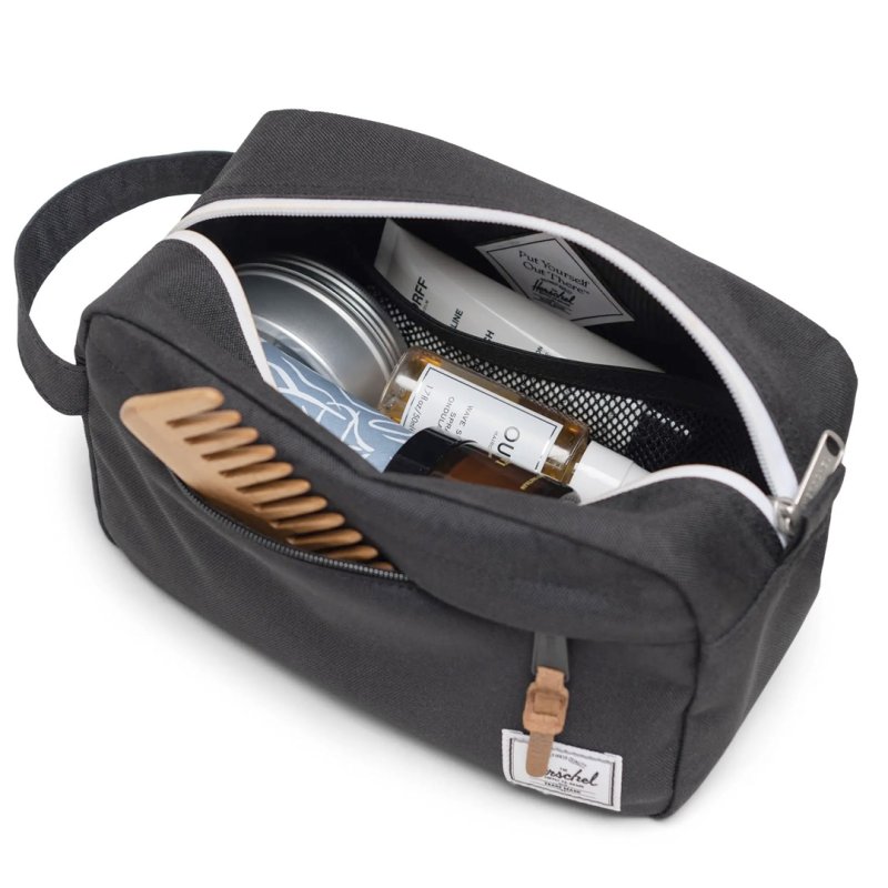 El kit de viaje “Herschel Chapter”, el compañero ideal para tus grandes viajes. Úsalo para guardar tu cepillo de dientes y tus artículos de aseo, o amplía sus límites y mantén los pequeños accesorios (como calcetines, cargadores, guías y mapas) bien organizados en tu equipaje. El tejido 600D está fabricado a partir de botellas de agua 100% recicladas, por lo que es duradero y respetuoso con el med