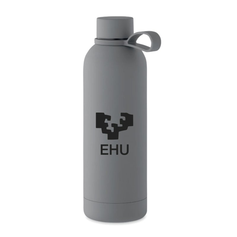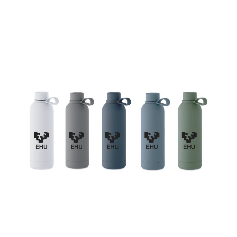 Botella de doble pared aislada al vacío de acero inoxidable reciclado (90% de acero inoxidable reciclado y 10% de acero inoxidable) con acabado de caucho y asa de silicona. Capacidad: 500 ml.