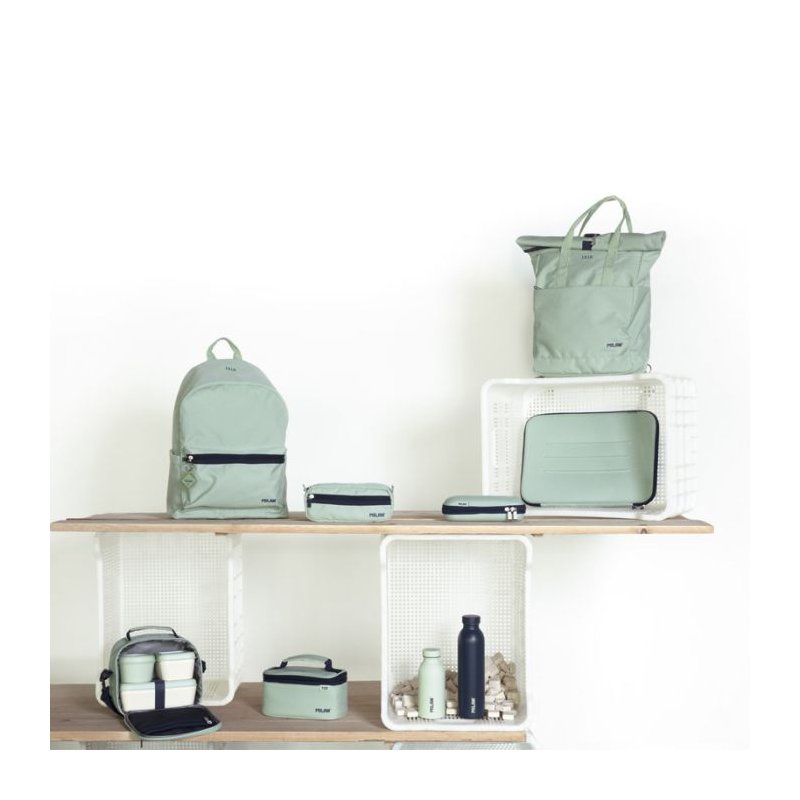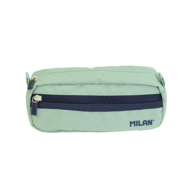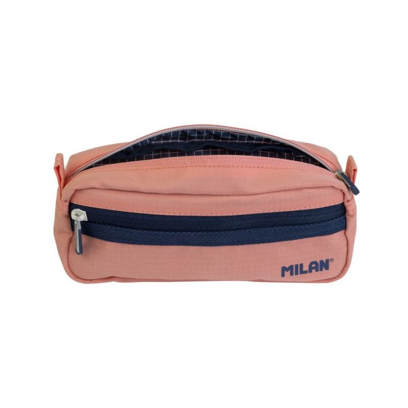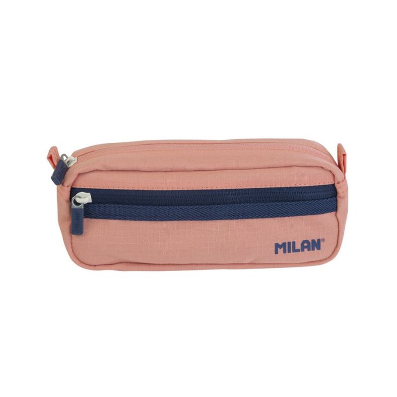 Estuche rectangular con 2 cremalleras. Serie 1918. Inspirada en los colores y diseño originales de las gomas de borrar MILAN. Con un pequeño bolsillo frontal y un gran compartimento principal. Forro interior estampado azul marino con una cuadrícula que evoca las formas de las gomas MILAN. Tejido exterior 'ripstop': ligero y resistente a la rotura y rasgaduras. Utiliza una técnica especial que teje