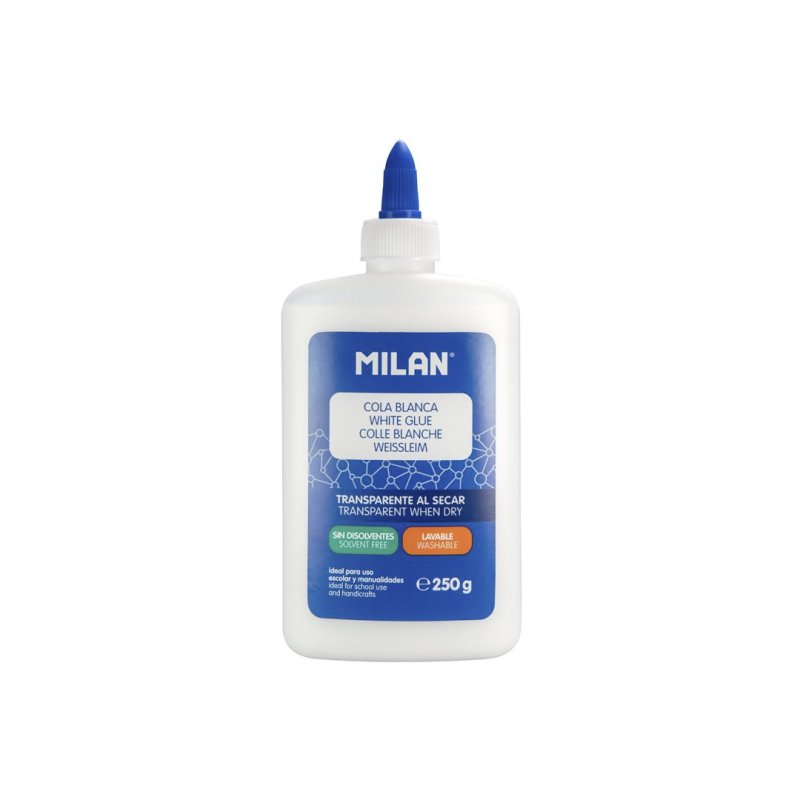 Cola blanca líquida, transparente al secarse. Lavable y sin disolventes. Ideal para uso escolar y manualidades. Pega fácilmente papel, cartulinas, fotografías, tejido, fieltro, corcho, cuero y espuma. Tapón con dosificador que permite una aplicaciónfácil y precisa.