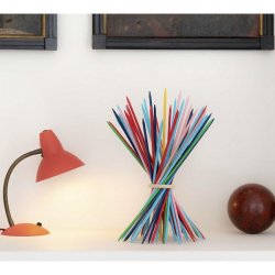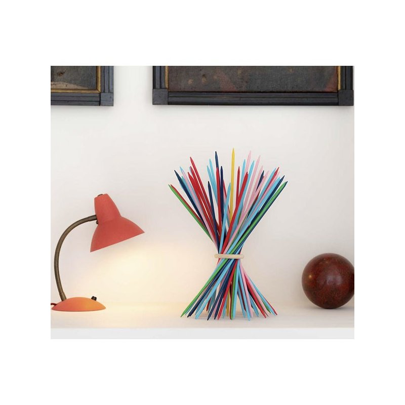 Utilizando el anillo de madera, los palos de madera de 40 cm de largo y colorido pueden formar decorativamente un objeto de diseño excepcional. Si se crea un “ramo” brillante de esta manera, los palos se pueden utilizar como un clásico juego de habilidad: Mikado – Para los amantes del diseño y los amantes de los juegos.