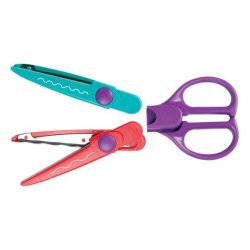 1 mango de plástico de color lila con 8 hojas intercambiables de distintos cortes. Cada hoja está recubierta de plástico y cuenta con un dibujo indicando el tipo de corte. Recomendada para manualidades y Scrapbooking.
