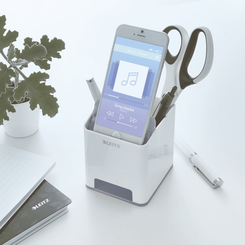 Este cubilete que incluye un diseño que aumenta el sonido del teléfono complementa perfectamente con otros productos de la gama WOW de Leitz.