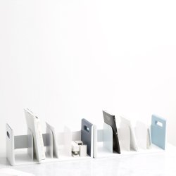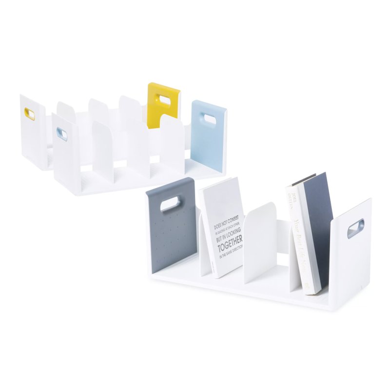 Soporte de almacenamiento Roomax de Litem con 4 compartimentos donde puedes guardar diferentes tipos de artículos como libros, revistas o cuadernos.