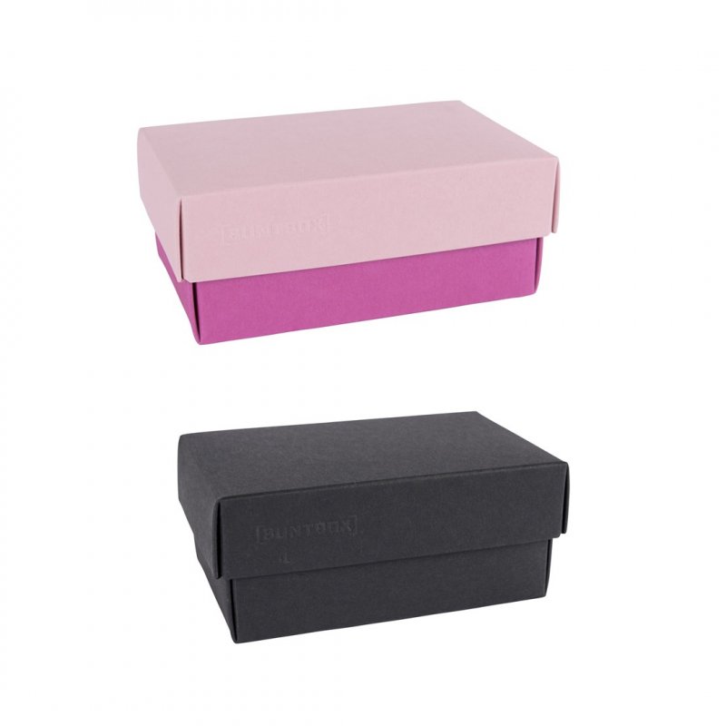 La caja de regalo de tamaño mediano BUNTBOX M es de 17 cm de largo, 11 cm de ancho y 6 cm de alto. La parte inferior de esta caja de regalo es un poco más grande que DIN A6.