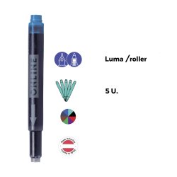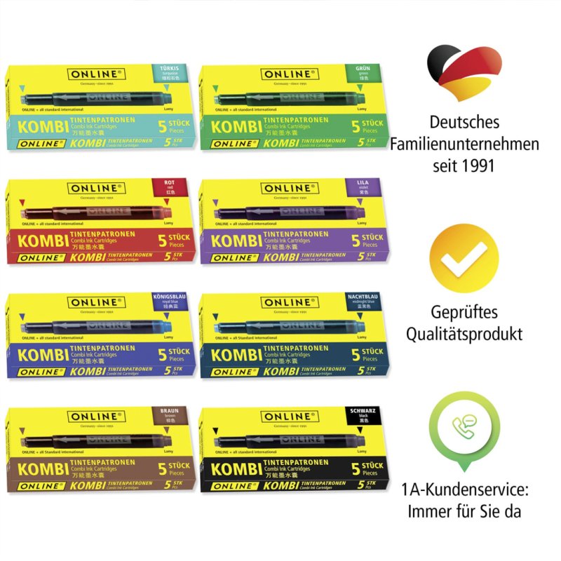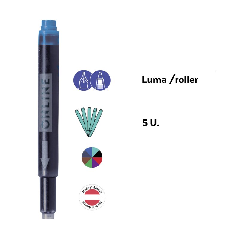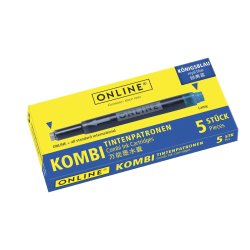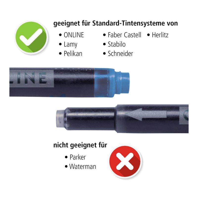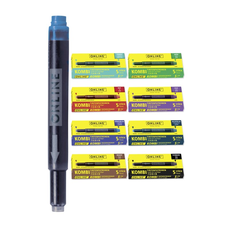 El cartucho combinado de ONLINE: ¡siempre encaja! El lado delgado se puede usar para ONLINE y todos los sistemas de llenado estándar y el lado grueso se puede usar para llenadores de cartuchos LAMY. La tinta de alta calidad garantiza un color de escritura intenso y de calidad constante.