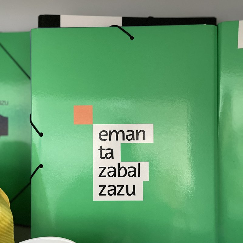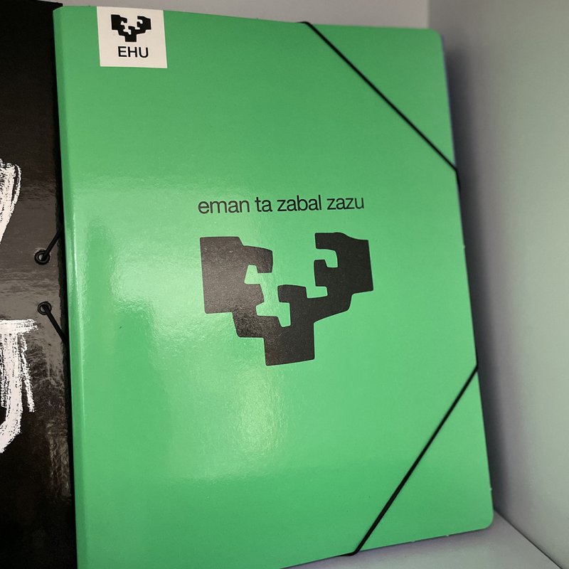 Carpeta de cartón con gomas EHU. Presenta la imagen renovada de la universidad, con un diseño moderno, limpio y representativo de nuestra identidad actual.