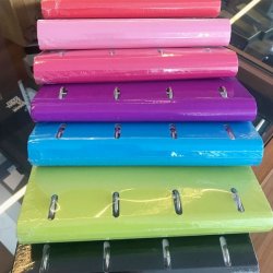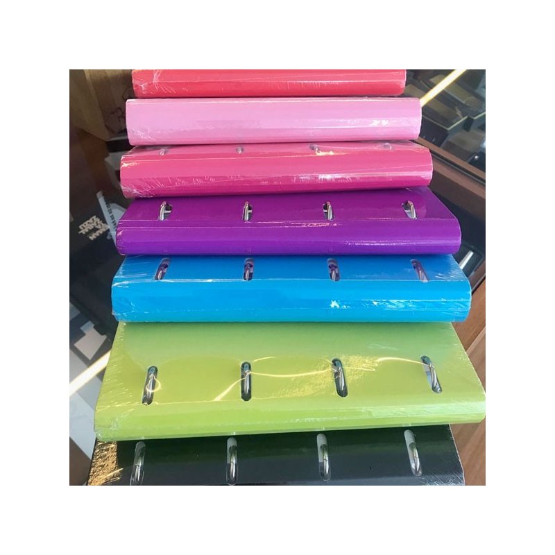 Carpeta de 4 anillas redondas de 25 mm en cartón forrado con papel impreso a todo color y plastificado. Con cierre de goma. Incluye el recambio de 100 hojas de 90 gramos con 6 bandas de color y cuadrícula de 5 mm.