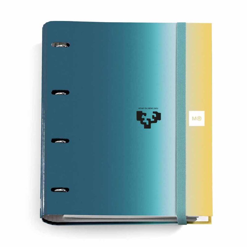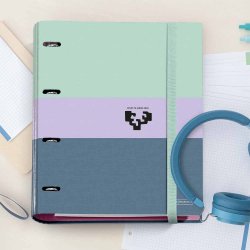 Carpeta de 4 anillas redondas de 25 mm en cartón forrado con papel impreso a todo color y plastificado. Con cierre de goma. Incluye el recambio de 100 hojas de 90 gramos con 6 bandas de color y cuadrícula de 5 mm.