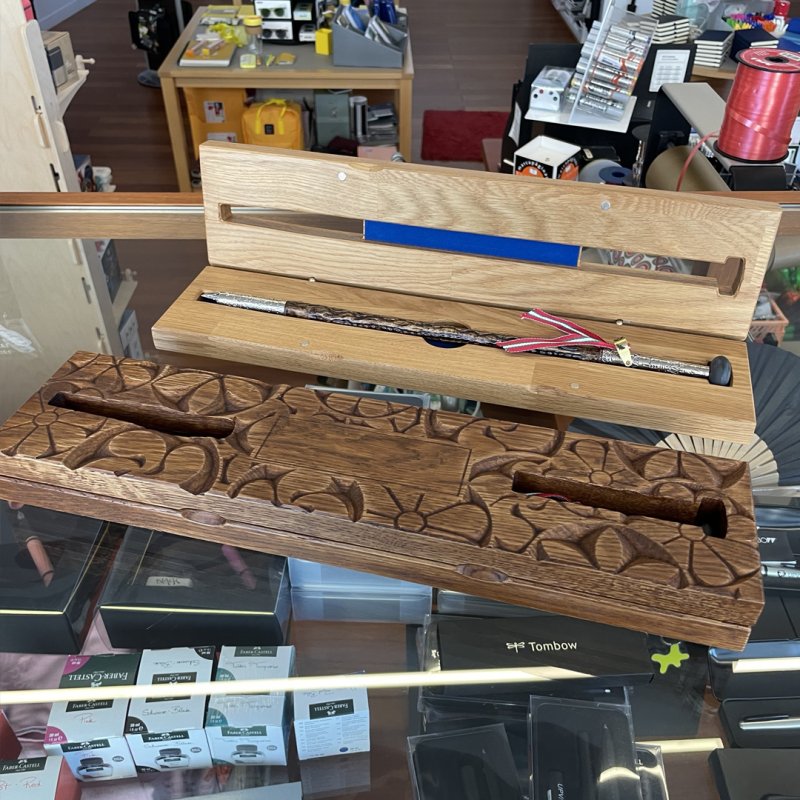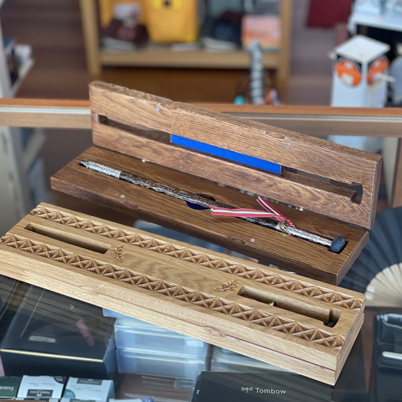 Reproducción a escala de la tradicional Makila vasca, fabricada en resinas y fundición con baño de plata, presentada en estuche de roble macizo tallado y con posibilidad de personalización.