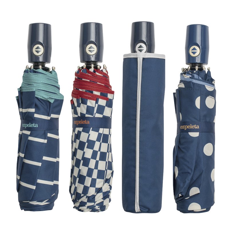 Añadir al carrito Add to wishlist Vista rápida PARAGUAS PLEGRABLE EZPELETA VARIOS COLORES UPV/EHU Precio 24,15 € Availability: Out of stock Paraguas plegable. 54/8 Aluminio abre-cierra automático con varillas de fibra de vidrio, 3 secciones. Liso. Tejido poliéster. Surtido de 12 colores.
