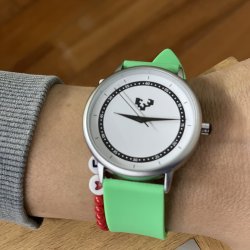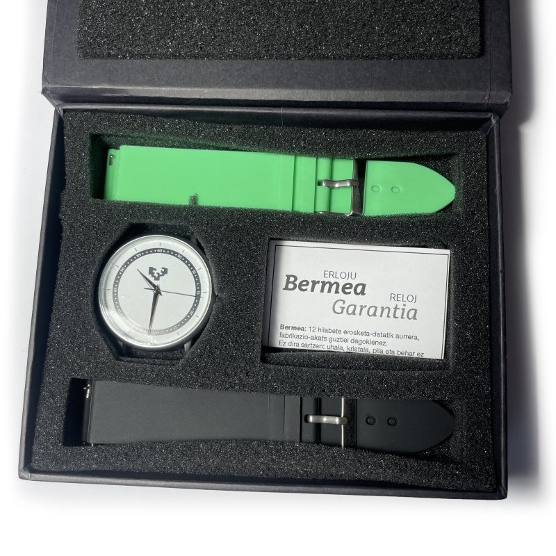 Reloj con esfera personalizada con el logo de Chillida EHU. Se presenta en caja de regalo e incluye dos correas intercambiables: una en color ehuberdea, perteneciente a la nueva imagen de la EHU, y otra en caucho negro, para adaptarse a cada ocasión con estilo.