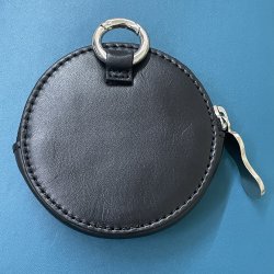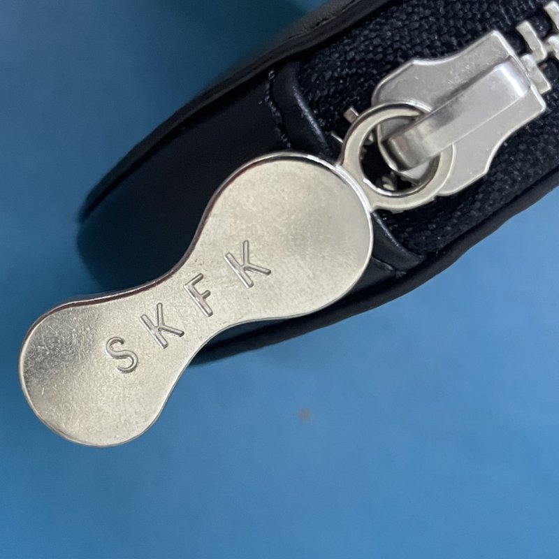 Cartera negra de piel con forma de galleta de SKFK, cierre de cremallera metálica con detalle del logo grabado. Original y funcional, con un diseño único.