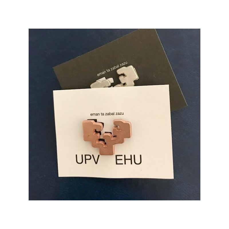 Chapa metálica de 3 cm en color blanco, personalizada con el logo de la UPV/EHU. Perfecta para solapas, chaquetas, bolsos o uniformes, esta chapa es una opción elegante y profesional para reforzar la identidad corporativa.