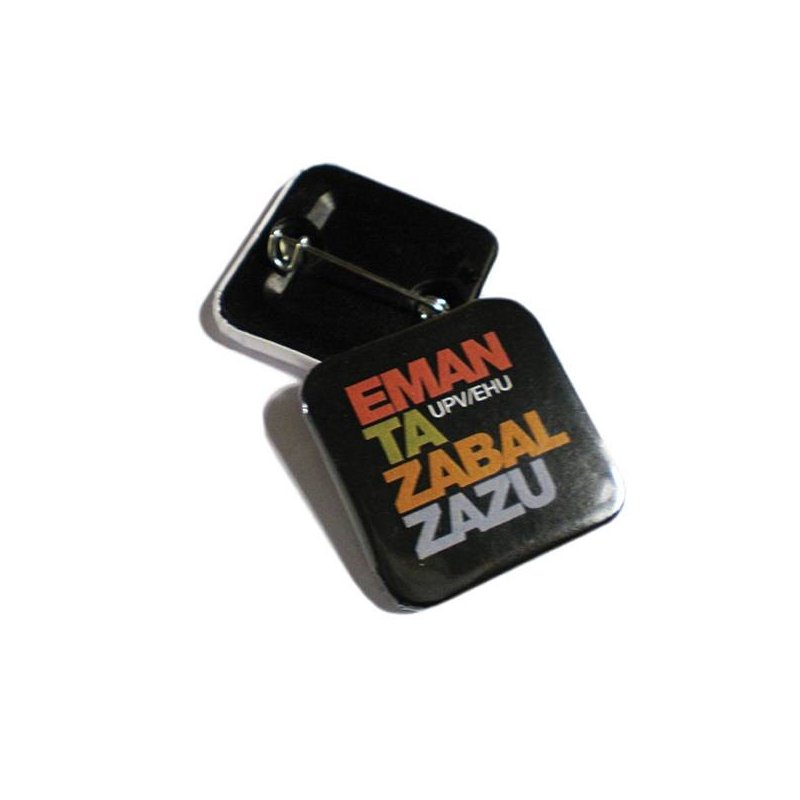 Chapa metálica de 3 cm en color negro, personalizada con el logo de la UPV/EHU. Perfecta para solapas, chaquetas, bolsos o uniformes, esta chapa es una opción elegante y profesional para reforzar la identidad corporativa.