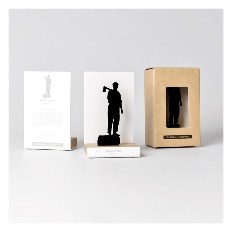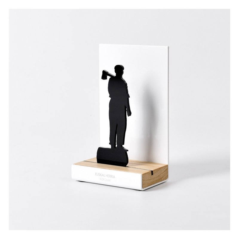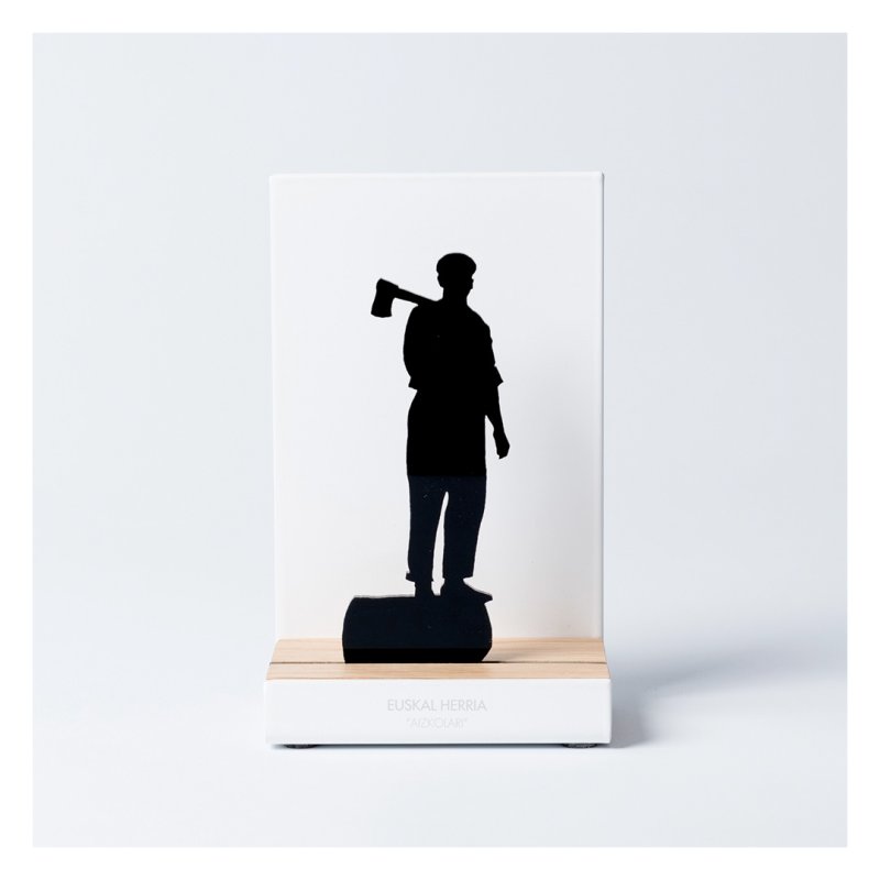 Figura souvenir con estructura de acero lacado en blanco, base de madera de roble y silueta con el motivo "Aizkolari" (Cortador de troncos) recortado a láser sobre me