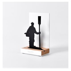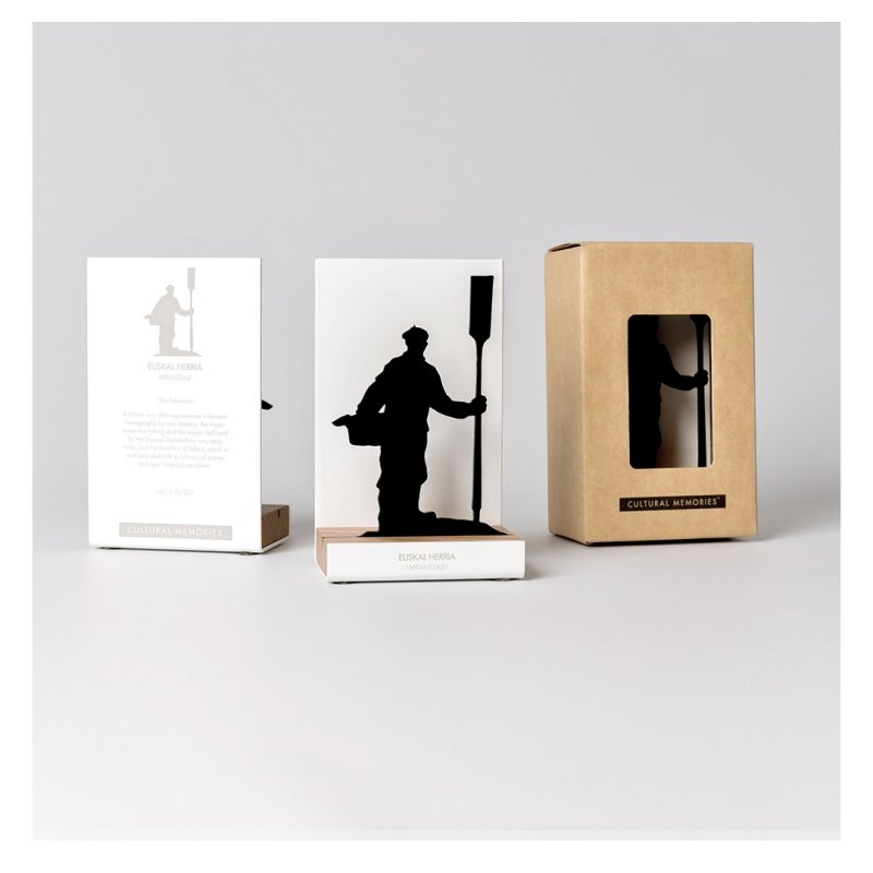 Figura souvenir con estructura de acero lacado en blanco, base de madera de roble y silueta con el motivo "Dantzari Mutila" (Bailarín) recortado a láser sobre metacrilato negro brillo de 3 mm de espesor.