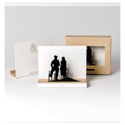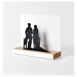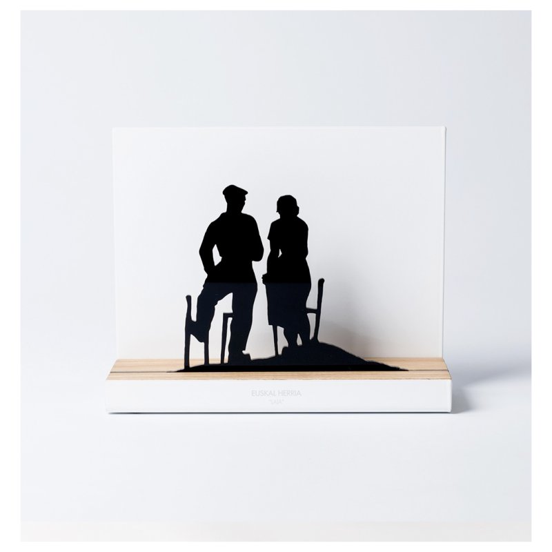 Figura souvenir con estructura de acero lacado en blanco, base de madera de roble y silueta con el motivo "Laia" (Utensilio de labranza) recortado a láser sobre metacrilato negro brillo de 3 mm de espesor.