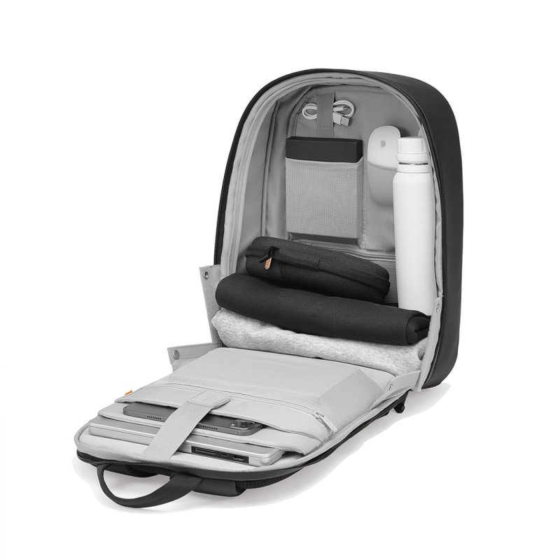 Mochila de viaje 2 en 1. Diseñada para transformarse durante el camino. El amplio compartimento principal está diseñado para guardar ropa. Abre la cremallera oculta y usa la Go Bag, más compacta, para tus imprescindibles diarios en tus paseos por la ciudad. Poliéster. El 100% del tejido exterior está fabricado con plástico PET reciclado. Dimensiones 44 x 31 x 24 cm / Volumen 26 L / Peso 1.6 kg