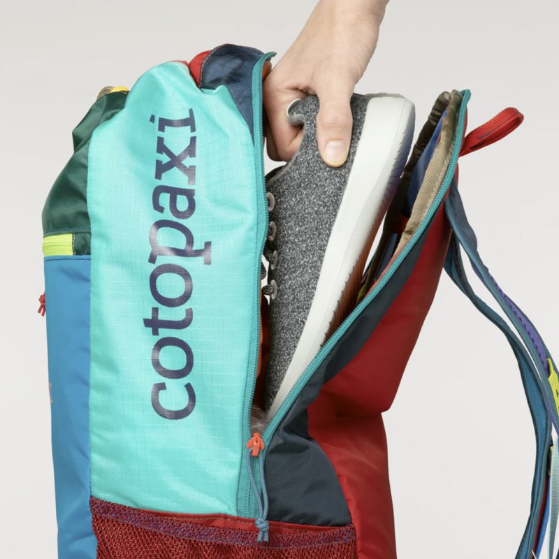 Gran compartimento principal. Compartimento para calzado con cremallera y separador interno. Cierre superior con cordón. Bolsillo frontal con cremallera. Tirantes de malla ultraligera. Organi