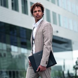 Bolso súper delgado hecho de tela obtenida de plástico reciclado con detalles de color contrastantes para portátil y MacBook. Compartimiento interno único con orejas de neopreno para bloquear el dispositivo. La parte delantera está equipada con un gran bolsillo exterior. Correa de hombro extraíble y asas de doble cinta.