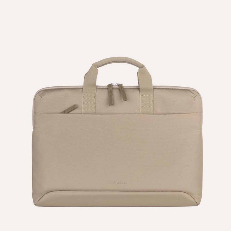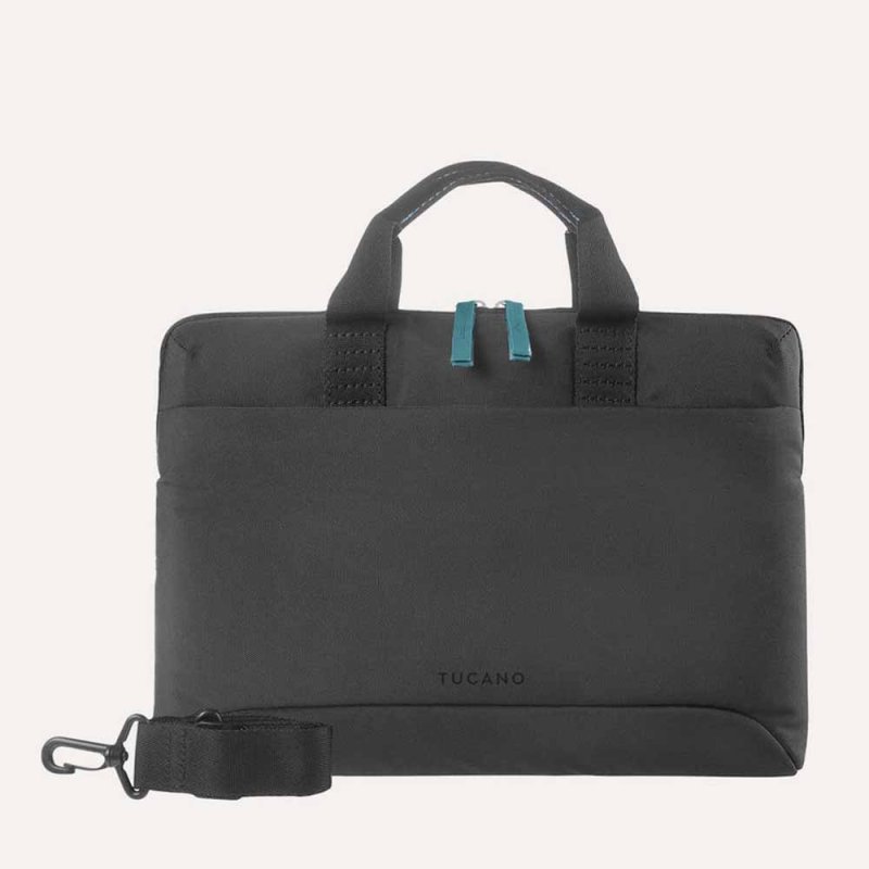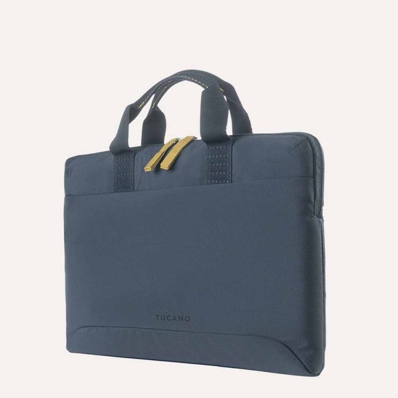 Bolso súper delgado hecho de tela obtenida de plástico reciclado con detalles de color contrastantes para portátil y MacBook. Compartimiento interno único con orejas de neopreno para bloquear el dispositivo. La parte delantera está equipada con un gran bolsillo exterior. Correa de hombro extraíble y asas de doble cinta.