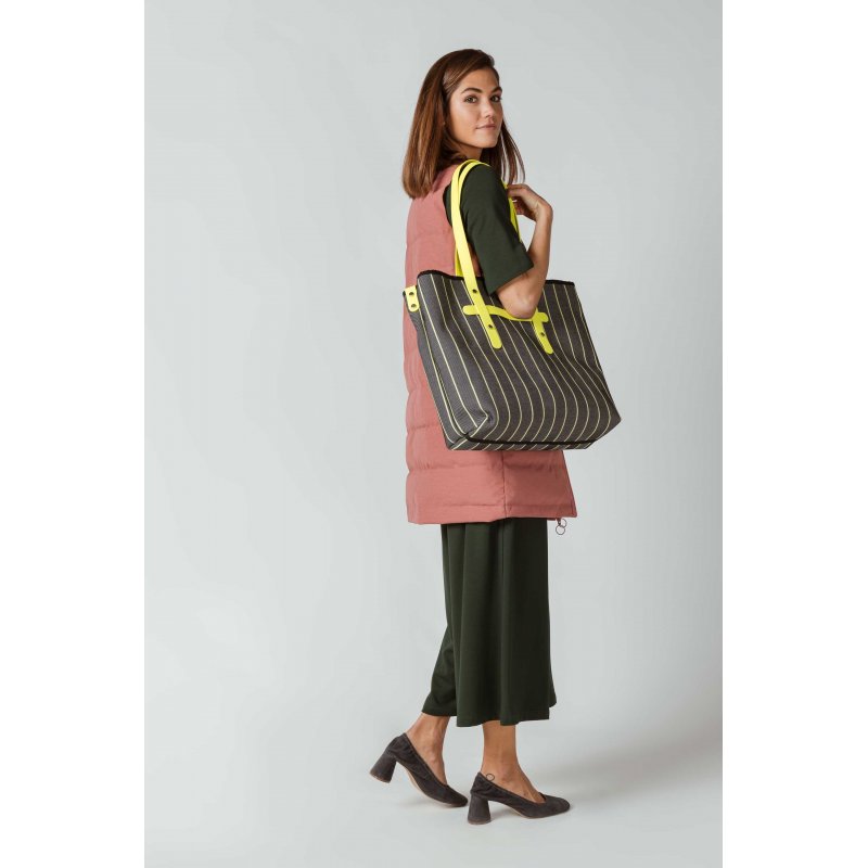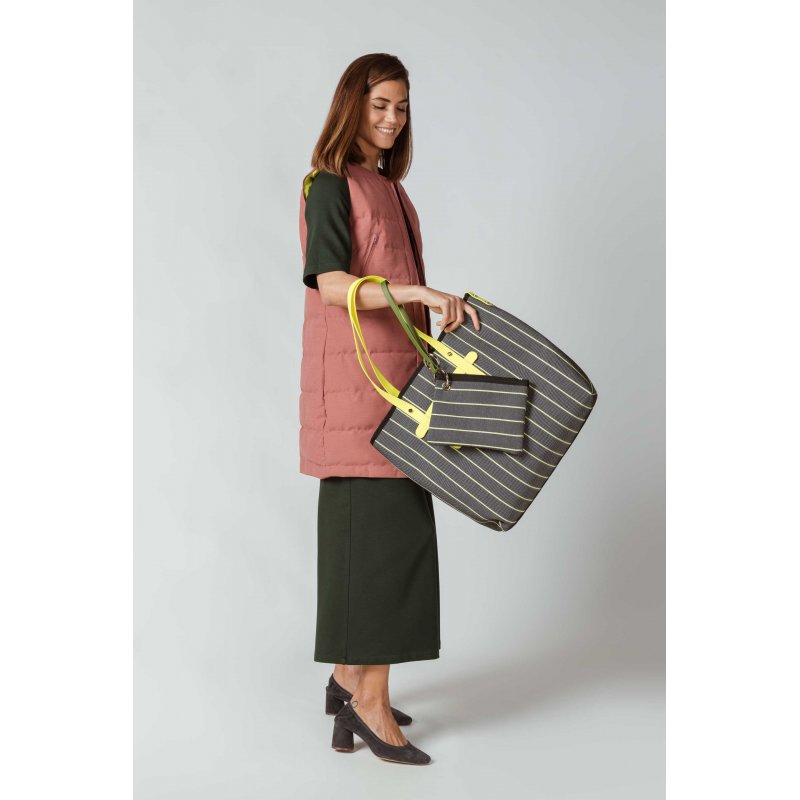 Esta bolsa amarilla o naranja de rayas está hecha de algodón reciclado y poliéster con correas en contraste y monedero a juego.