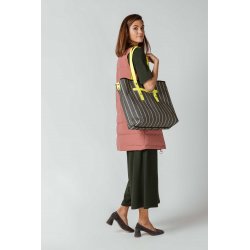 Esta bolsa amarilla o naranja de rayas está hecha de algodón reciclado y poliéster con correas en contraste y monedero a juego. 54% ALDOGON RECICLADO + 46% POLIESTER RECICLADO