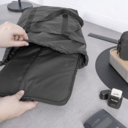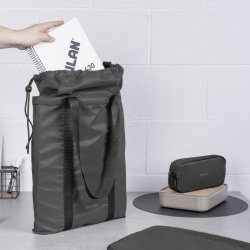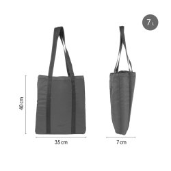 Bolso shopper de piel y algodón reciclado con bolsillos delanteros y traseros, correa ajustable y desmontable, cierre de cremallera y botones a presión para ajustar el tamaño. Con un bolsillo interior y forro estampado, mide 400 x 280 x 140 mm.