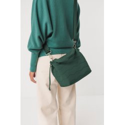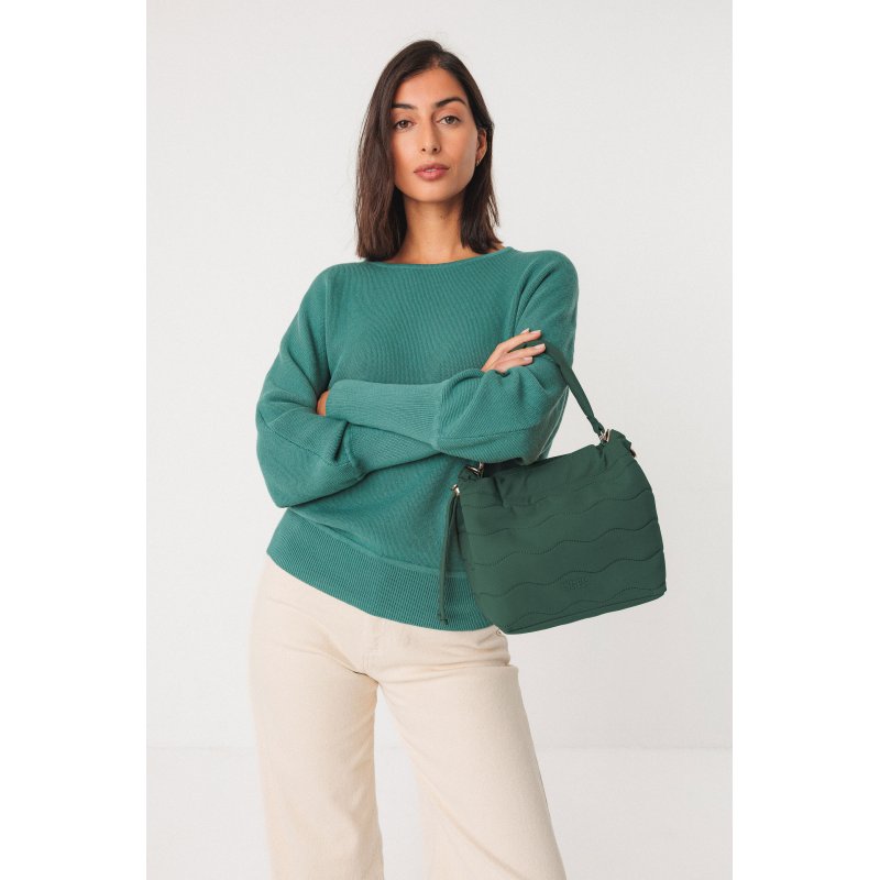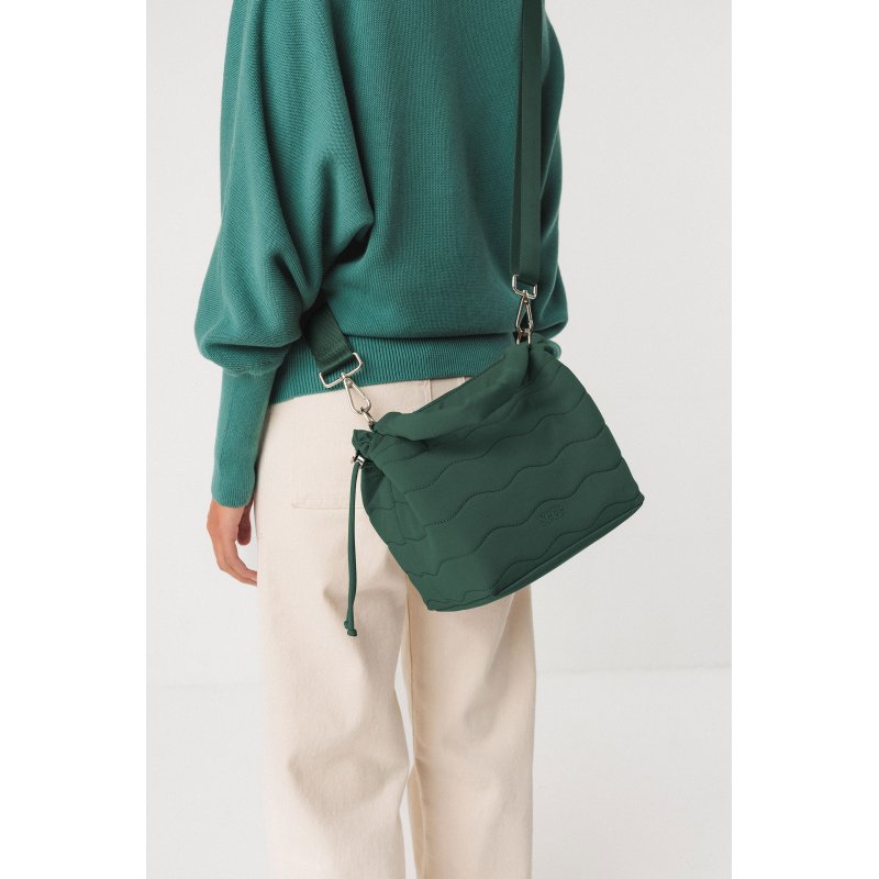 Bolso cuadrado ajustable con cordones elásticos en los laterales. Tiene dos bolsillos y se puede llevar en bandolera con la correa ajustable o en la mano con el asa. Medidas: 20 x 20 x 15 cm.