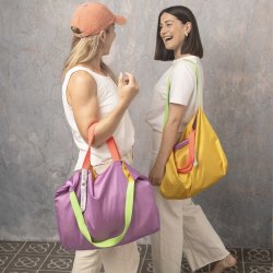 Su combinación Lemon-Lila / Lila-Lemon nos transporta a los colores de las puestas de sol de aldeas que tocan al mar. La paleta de colores morados y amarillos rompen con el verde de la vegetación del lugar