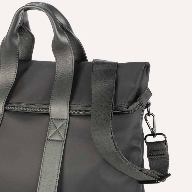 Sofisticado diseño para la bolsa Fold, de nailon reciclado y piel, concebida para el trabajo y el ocio. El compartimento interior, con un refinado forro a rayas, cuenta con un bolsillo protector para un portátil de 15,6" o un MacBook de 16", al que se accede fácilmente a través de una segunda abertura en el panel trasero. Gr