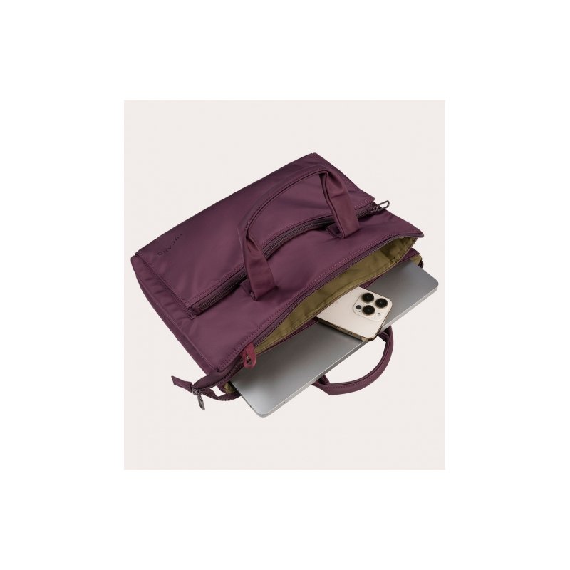 Bolsa ligera y compacta para MacBook 16 y portátiles de hasta 15.6", fabricada con tejido procedente de plástico reciclado. La construcción de doble compartimento, reforzada por un espacio central y un bolsillo exterior para accesorios, ofrece una buena organización del espacio. Equipada con correa para el hombro extraíble.