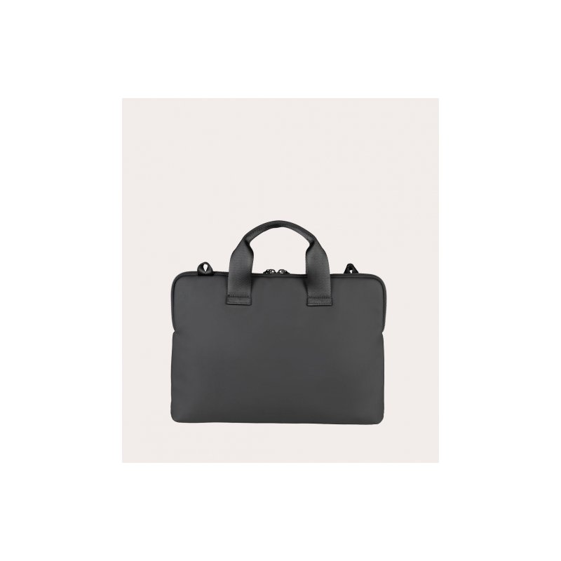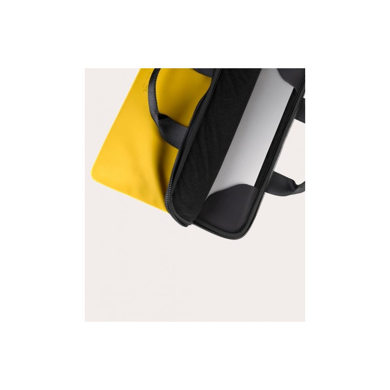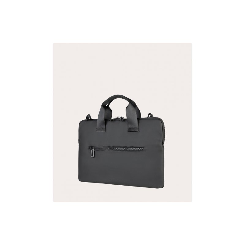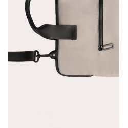 Bolsa ligera y compacta para MacBook y portátiles de hasta 14", fabricada con tejido procedente de plástico reciclado. La construcción de doble compartimento, reforzada por un espacio central y un bolsillo exterior para accesorios, ofrece una buena organización del espacio. Equipada con correa para el hombro extraíble.