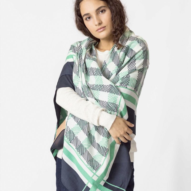 Pañuelo cuadrado grande hecho de algodón orgánico certificado GOTS y BSCI. Estampado multicolor. Estar certificado sienta muy bien. GOTS está reconocida como la principal norma mundial de procesamiento de textiles fabricados con fibras orgánicas. BSCI es un sistema de control social para el abastecimiento ético, cuyo objetivo es mejorar las condiciones de trabajo en la