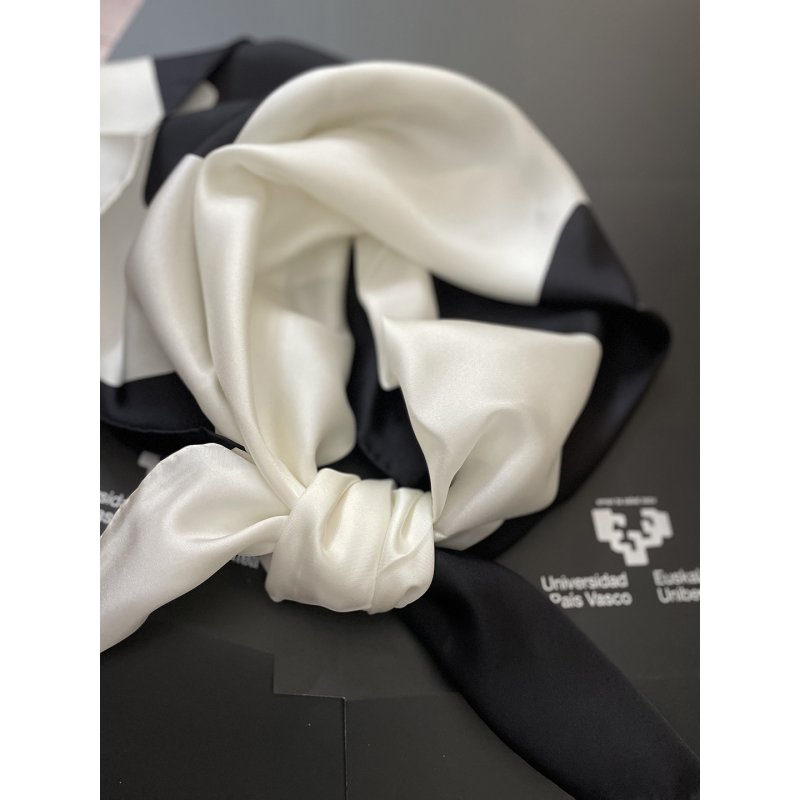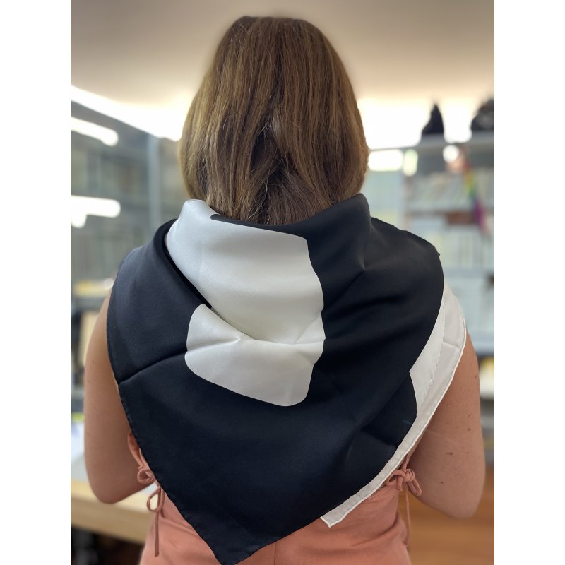 Combinación de elegancia e individualidad en este pañuelo de seda estampado en negro y blanco roto.