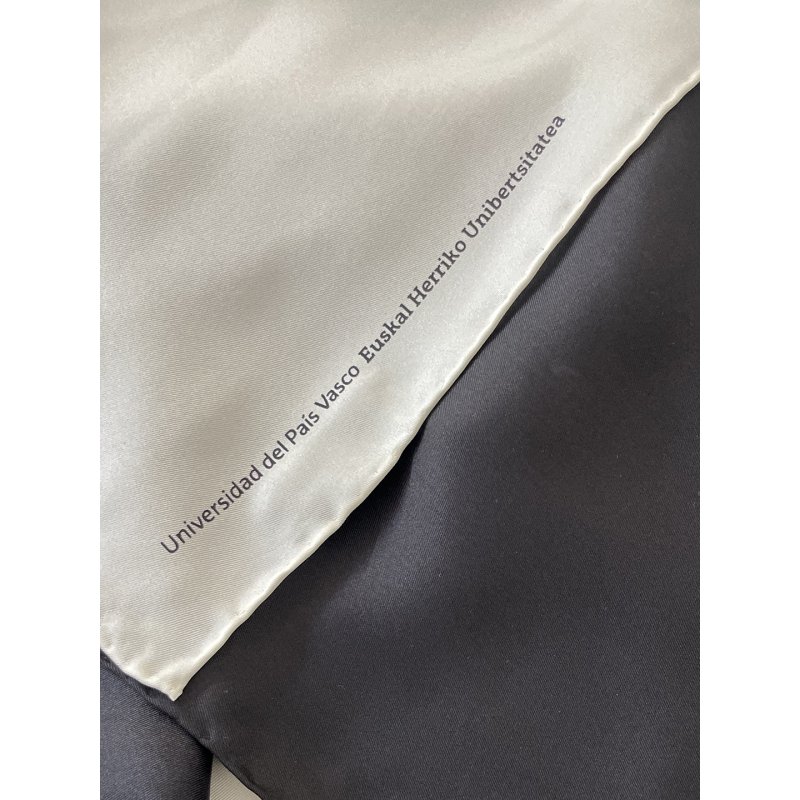 Combinación de elegancia e individualidad en este pañuelo de seda estampado en negro y blanco roto. Logo UPV/EHU como motivo global para un pañuelo en negro y blanco roto.. Firma "Euskal Herriko Unibertsitatea /Universidad del País Vasco" en borde claro. Cosido a mano.