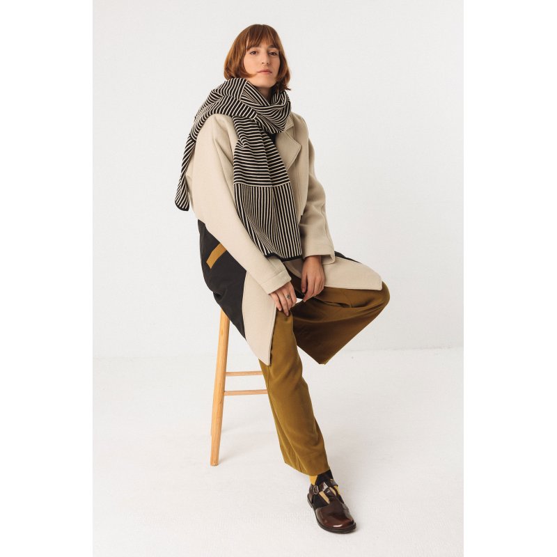 Combinación de elegancia e individualidad en este pañuelo de seda estampado en negro y blanco roto.