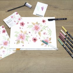 Watercoloring Set Floral contains: ABT-192, 757, 772, 910, 991, WS-EFL03 (line thickness 0.35 mm), MONO 100 hard (MONO-100-H), MONO dust CATCH (EN-DC), water brush medium (WB-ME-1P), blending palette, instructions