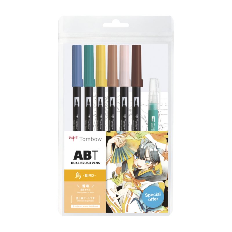 鳥 Bird set: 6 ABT colors (ABT-515, -407, -025, -912, -761, -899), 1 water brush, 2 coloring templa
