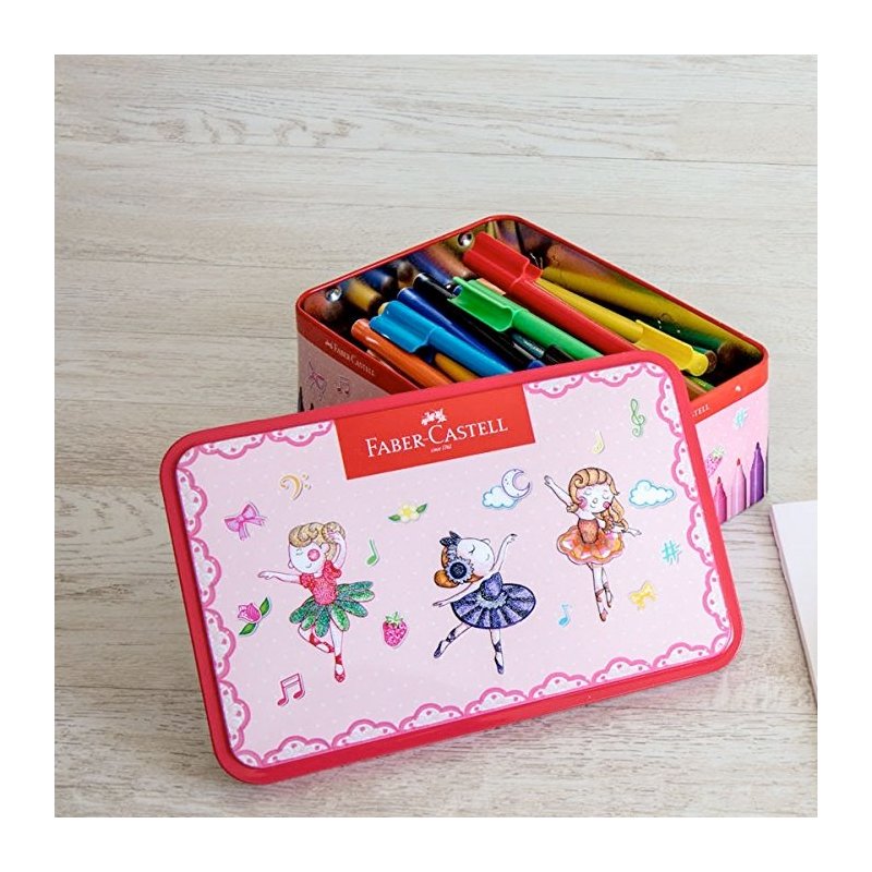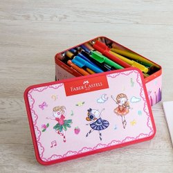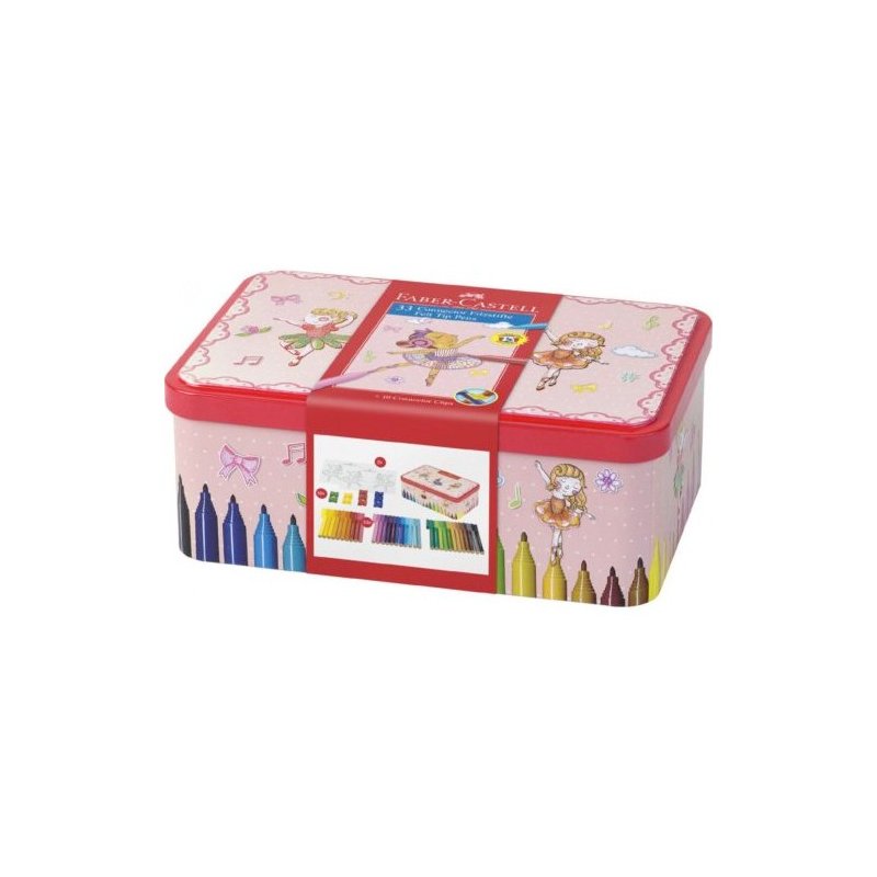 Caja metálica bailarina con 33 rotuladores connector , 10 conectores, 2 plantillas para colorear con motivo de bailarina y 1 folleto.