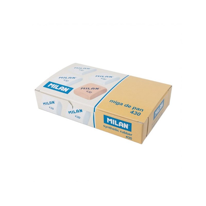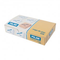 Goma suave de caucho sintético tipo miga de pan. Para borrar una amplia gama de lápices de grafito sobre toda clase de papeles. Con faja de cartón azul y envuelta individualmente. Medidas goma: 5,5 x 2,3 x 1,3 cm. Las gomas de borrar MILAN están fabricadas en España desde 1918.